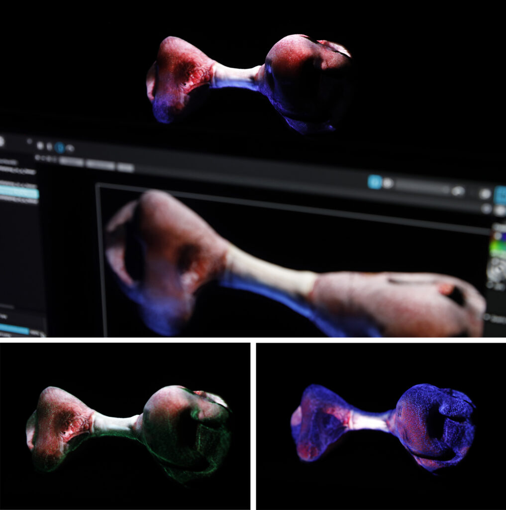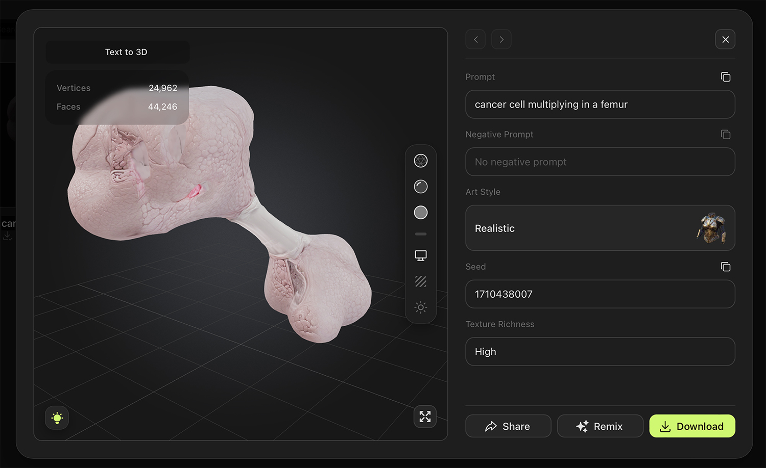 First step: Generation of a 3D model using a text prompt (“cancer cell multiplying in a femur”). Several iteration cycles and selection processes were conducted before reaching this model.